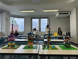 2週目は発表会です。事前に作成した計画書をもとに、30分の制限時間内でタワーの組み立てに挑みました。ブロックを積み上げる役、パーツを色分けする役など、チーム内で役割分担をしながら、効率的に作業を進めている様子が見られました。タワーの外見だけでなく内部構造にも工夫が見られ、各チームの発想やこだわりが感じられて、とても興味深かったです。発表ではタワーのコンセプトや工夫したところを伝えてもらいました。
